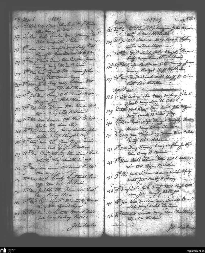 Cloyne; County of Cork; Diocese of Cloyne. Baptisms, Mar. 1807 to Apr. 1807