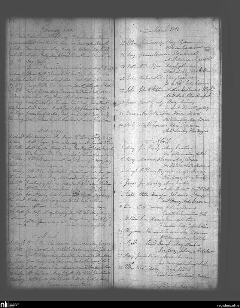 Cloyne; County of Cork; Diocese of Cloyne. Baptisms, Jan. 1821 to Apr. 1821