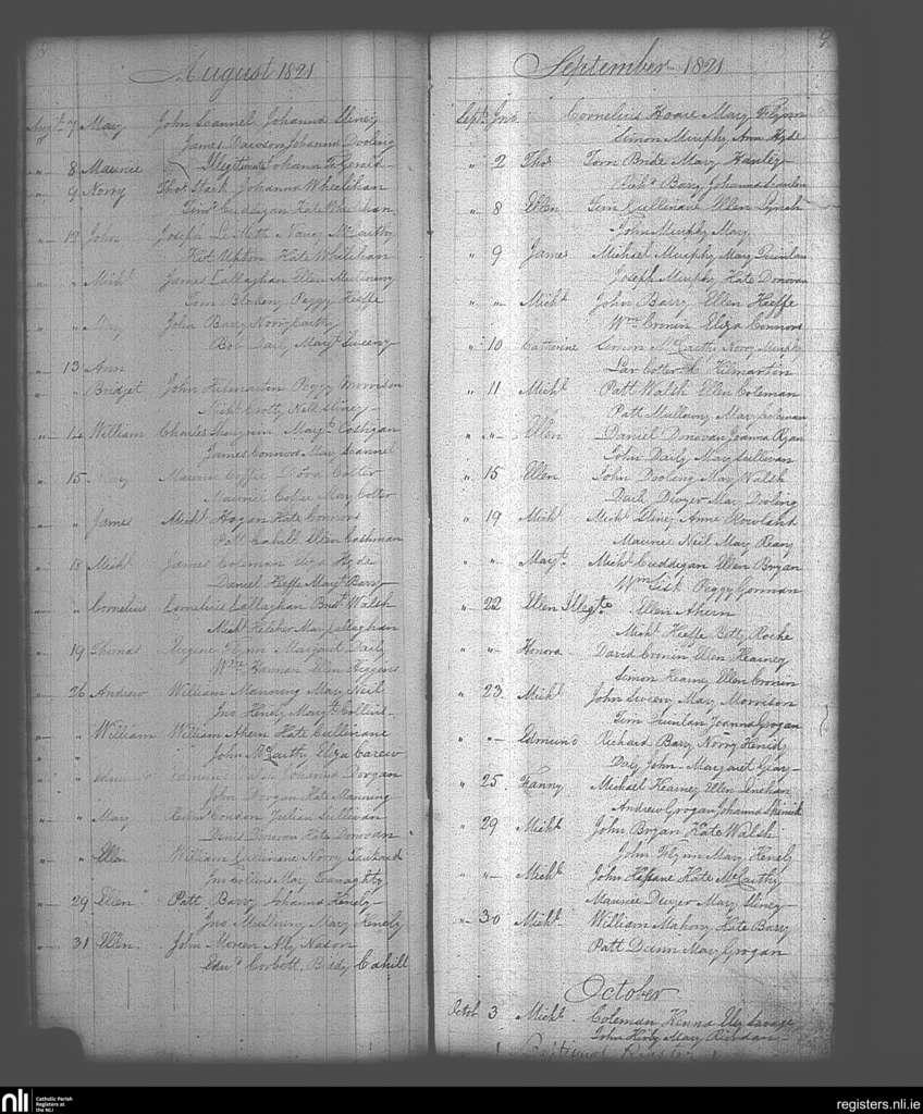 Cloyne; County of Cork; Diocese of Cloyne. Baptisms, Aug. 1821 to Oct. 1821