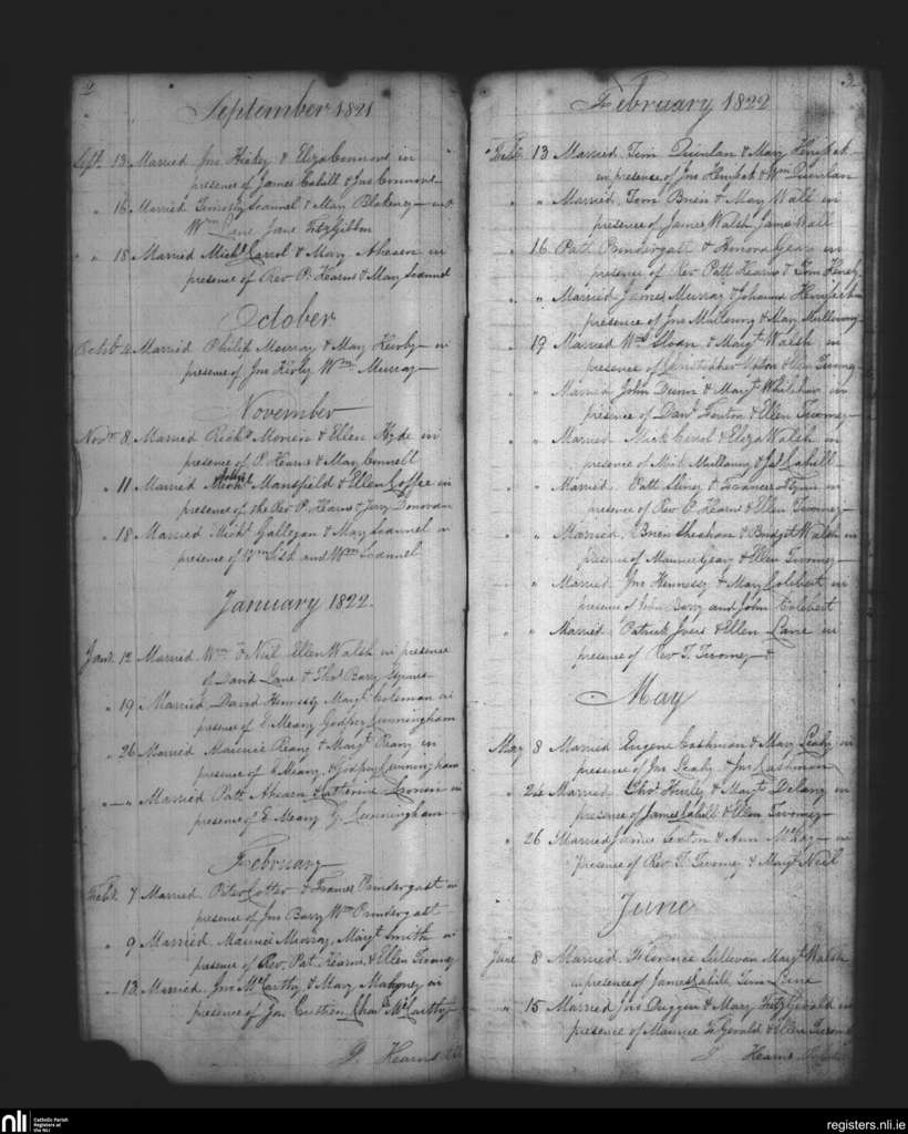 Cloyne; County of Cork; Diocese of Cloyne. Marriages, Sep. 1821 to June 1822