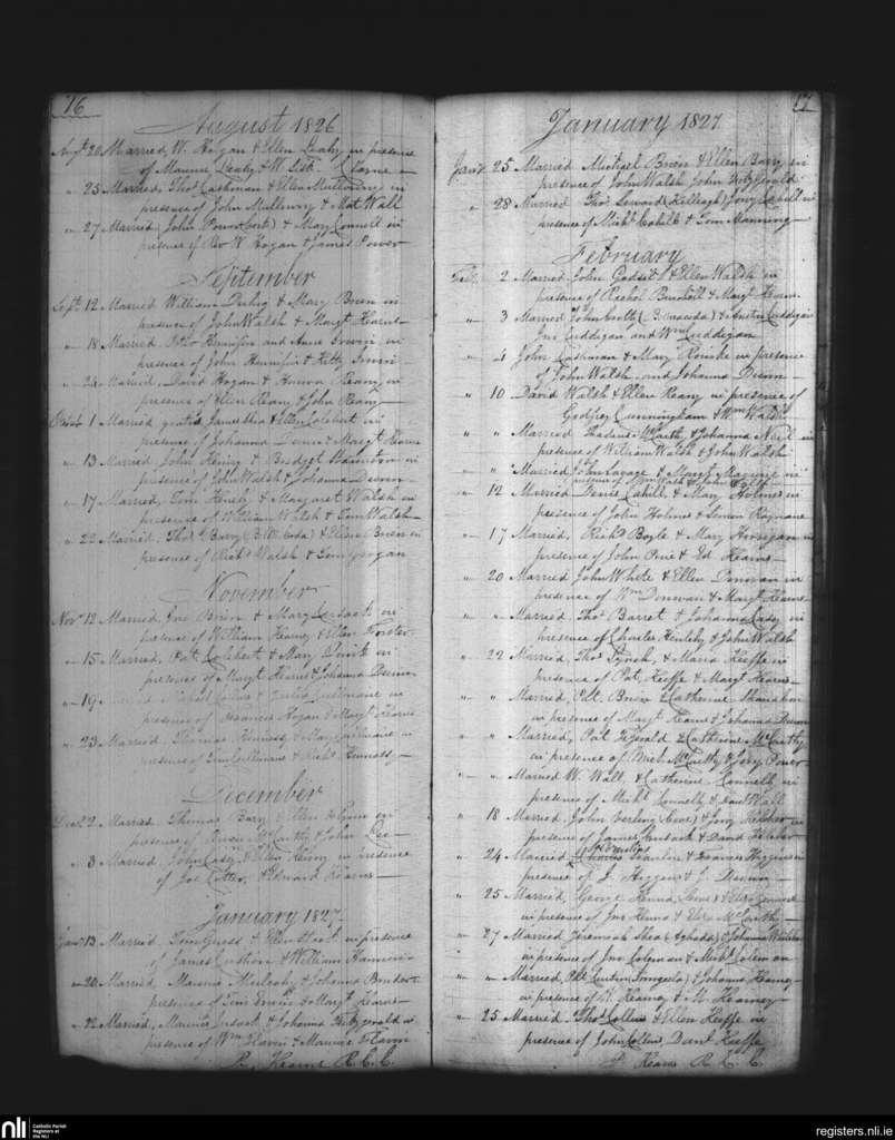 Cloyne; County of Cork; Diocese of Cloyne. Marriages, Aug. 1826 to Feb. 1827