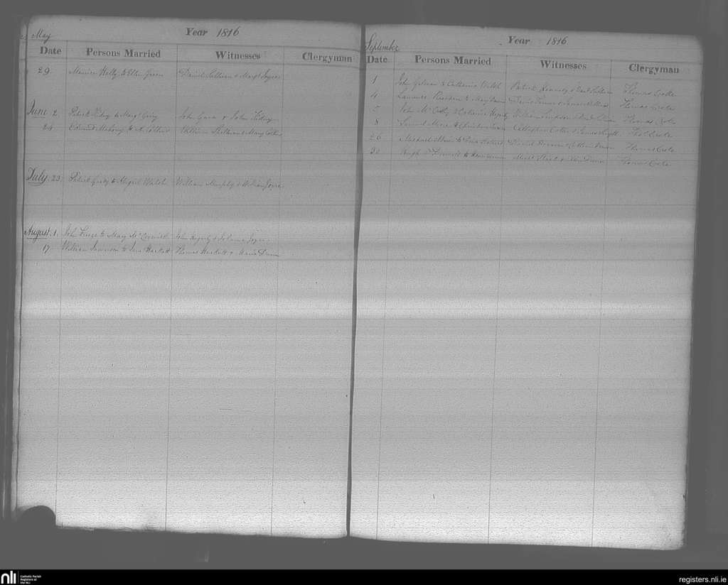 Cobh; County of Cork; Diocese of Cloyne. Marriages, May 1816 to Sep. 1816