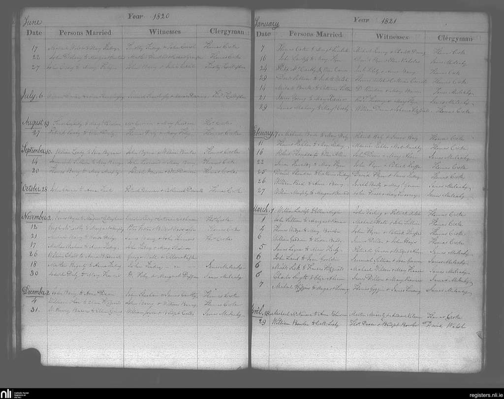 Cobh; County of Cork; Diocese of Cloyne. Marriages, June 1820 to Apr. 1821