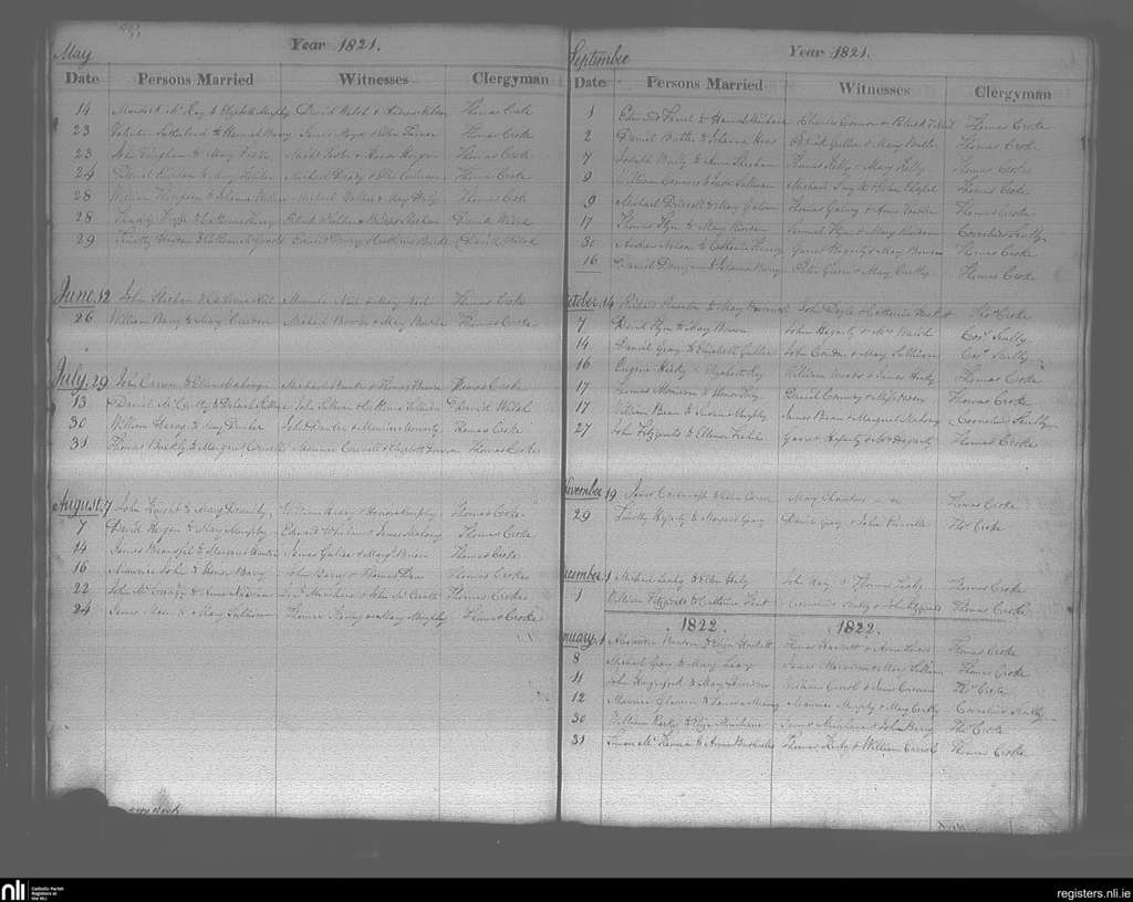Cobh; County of Cork; Diocese of Cloyne. Marriages, May 1821 to Jan. 1822