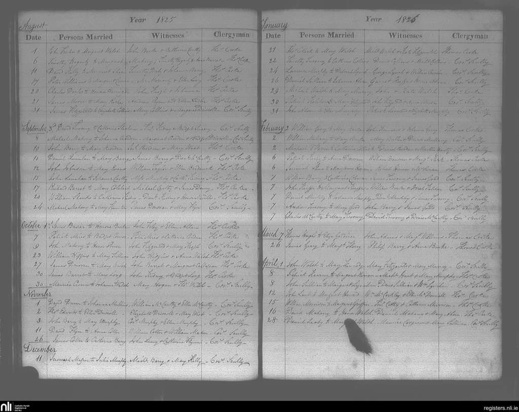 Cobh; County of Cork; Diocese of Cloyne. Marriages, Aug. 1825 to Apr. 1826