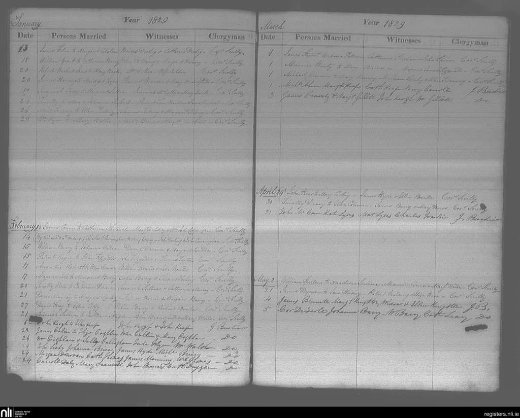 Cobh; County of Cork; Diocese of Cloyne. Marriages, Jan. 1829 to May 1829