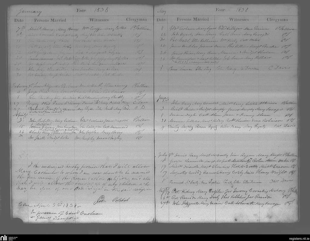 Cobh; County of Cork; Diocese of Cloyne. Marriages, Jan. 1838 to Aug. 1838