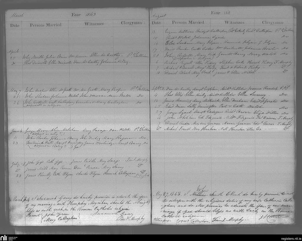 Cobh; County of Cork; Diocese of Cloyne. Marriages, Mar. 1843 to Sep. 1843