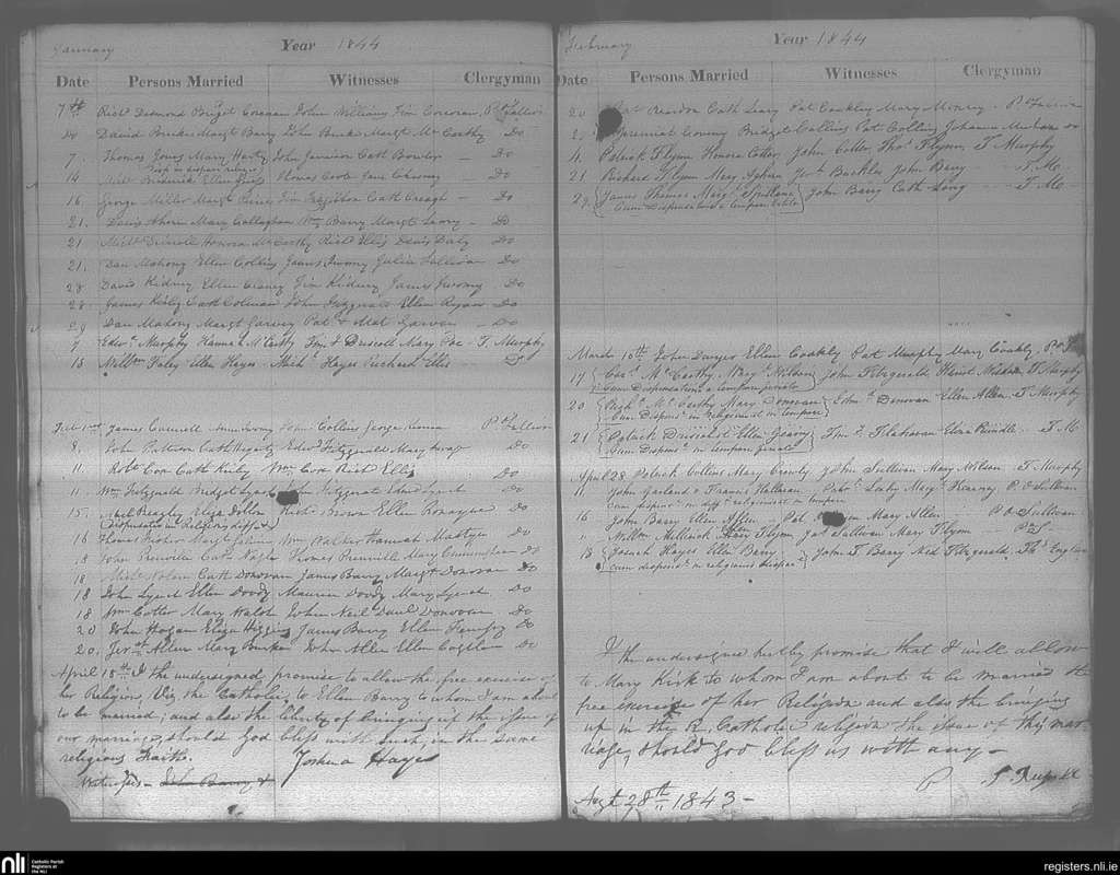 Cobh; County of Cork; Diocese of Cloyne. Marriages, Aug. 1843 to Apr. 1844