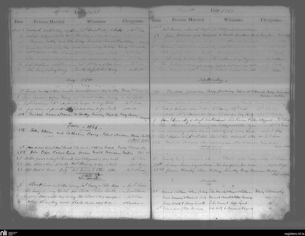 Cobh; County of Cork; Diocese of Cloyne. Marriages, Apr. 1864 to Nov. 1864