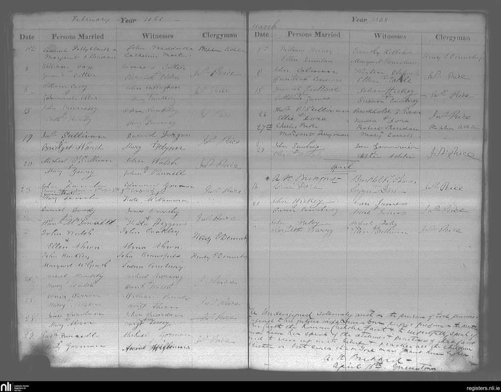 Cobh; County of Cork; Diocese of Cloyne. Marriages, Feb. 1868 to Apr. 1868