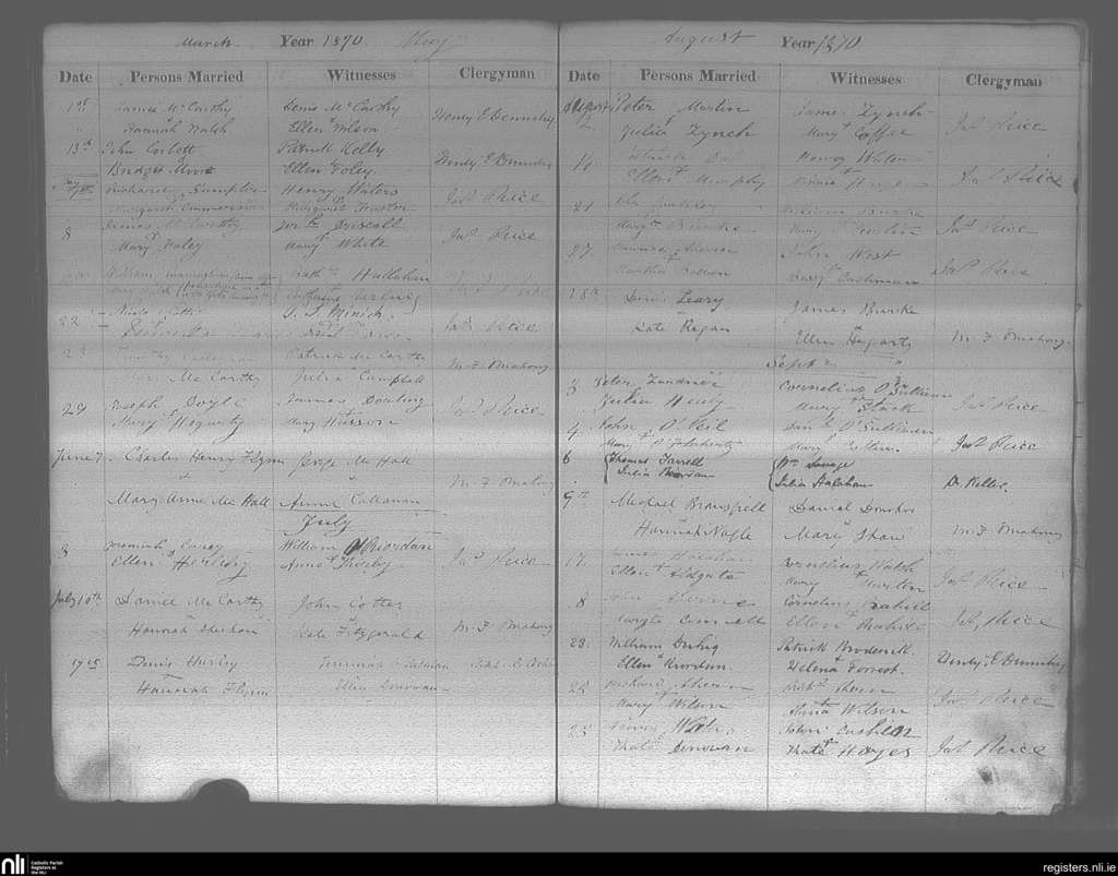 Cobh; County of Cork; Diocese of Cloyne. Marriages, Mar. 1870 to Sep. 1870