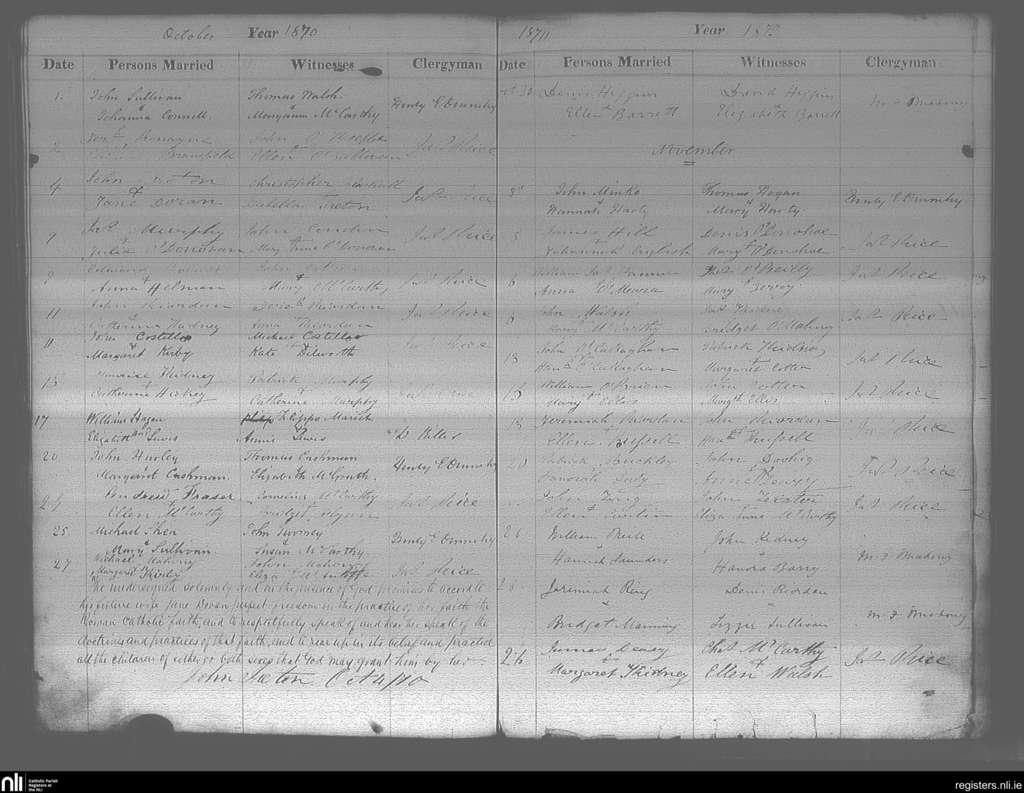 Cobh; County of Cork; Diocese of Cloyne. Marriages, Oct. 1870 to Nov. 1870