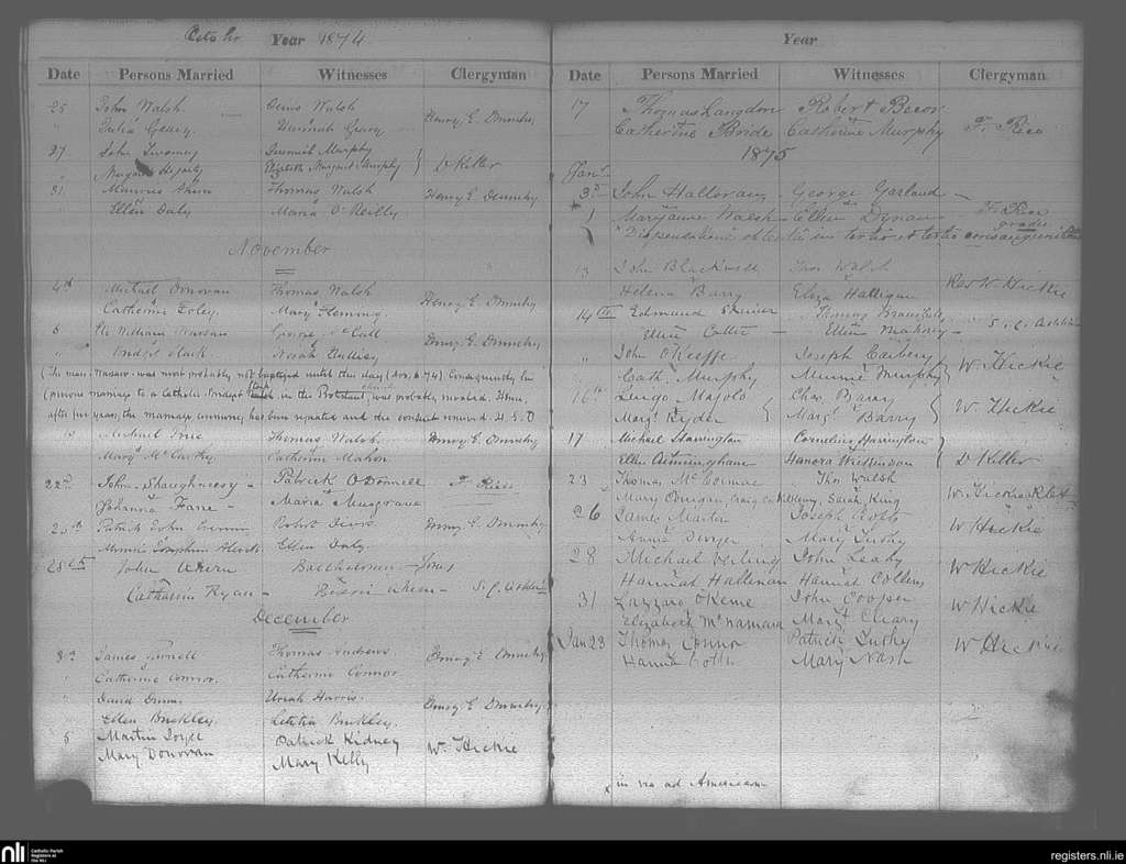 Cobh; County of Cork; Diocese of Cloyne. Marriages, Oct. 1874 to Jan. 1875