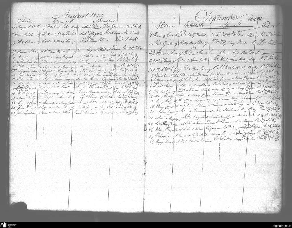 Cobh; County of Cork; Diocese of Cloyne. Baptisms, Aug. 1822 to Sep. 1822