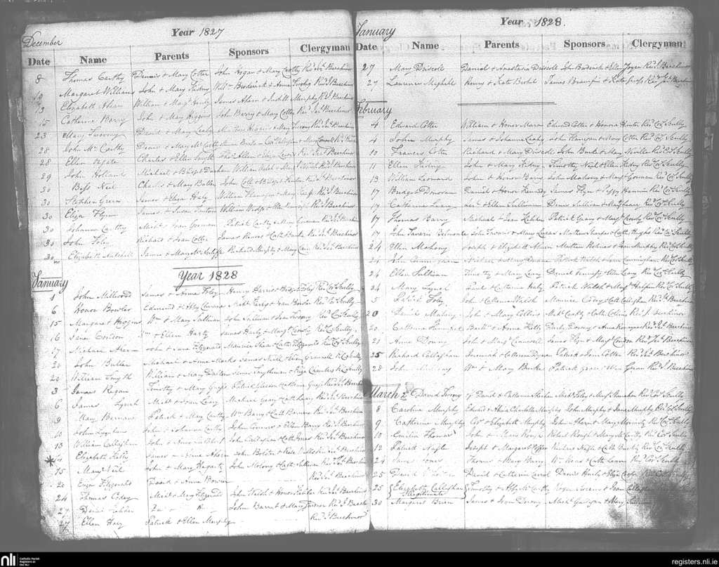 Cobh; County of Cork; Diocese of Cloyne. Baptisms, Dec. 1827 to Mar. 1828