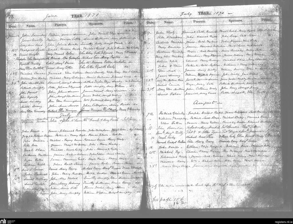 Cobh; County of Cork; Diocese of Cloyne. Baptisms, June 1870 to Aug. 1870