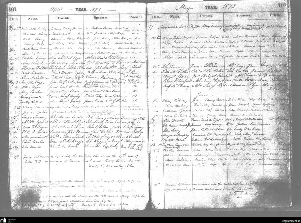 Cobh; County of Cork; Diocese of Cloyne. Baptisms, Apr. 1873 to June 1873