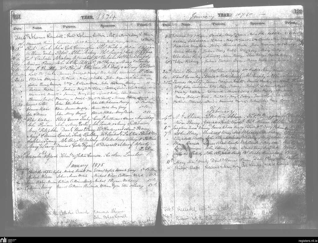 Cobh; County of Cork; Diocese of Cloyne. Baptisms, Dec. 1874 to Feb. 1875