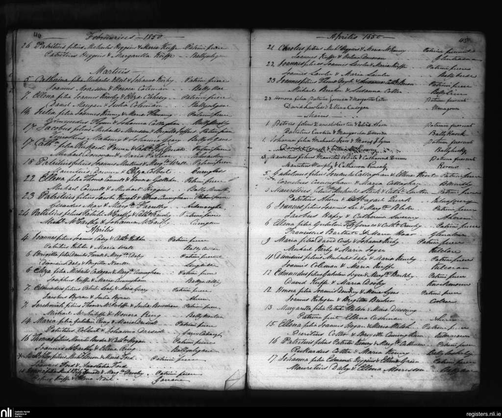 Conna; County of Cork; Diocese of Cloyne. Baptisms, Feb. 1850 to May 1850