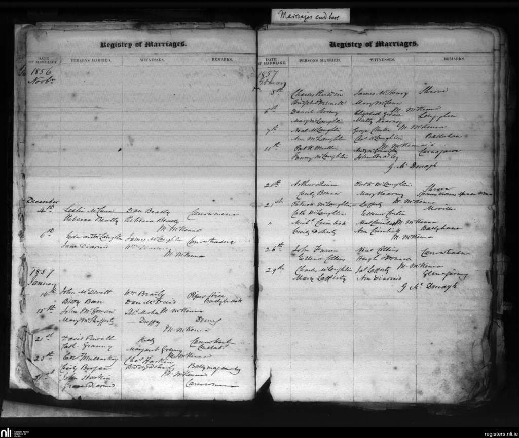Moville; County of Donegal; Diocese of Derry. Marriages, Nov. 1856 to Feb. 1857