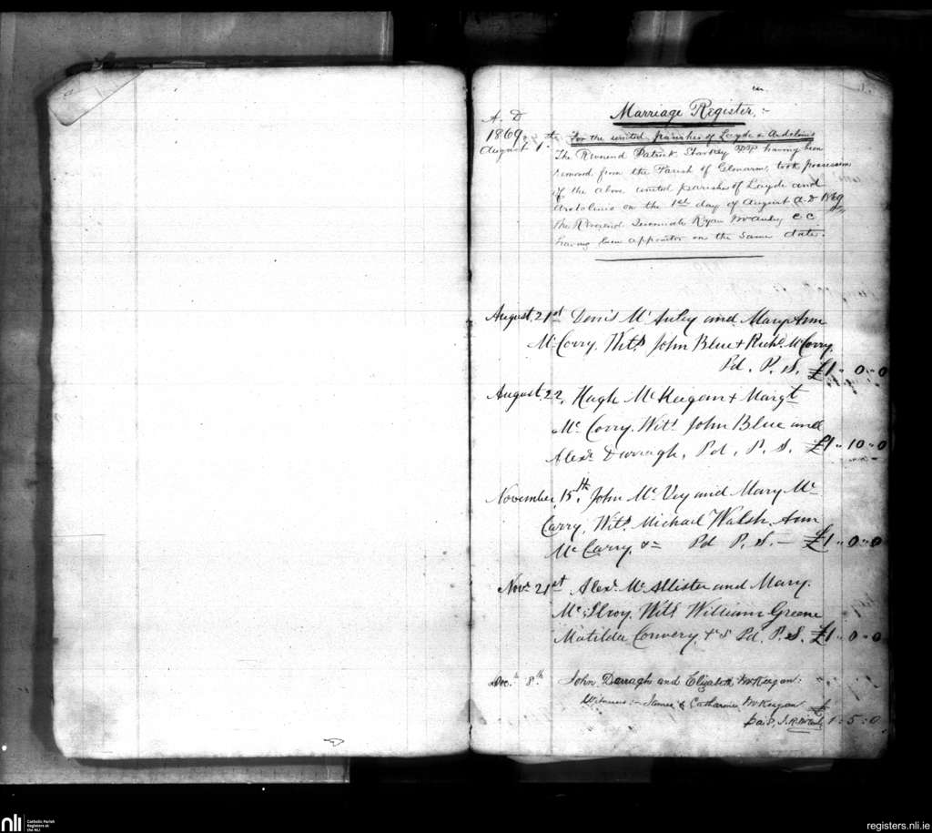 Layde; County of Antrim; Diocese of Down and Connor. Marriages, Aug. 1869 to Dec. 1869