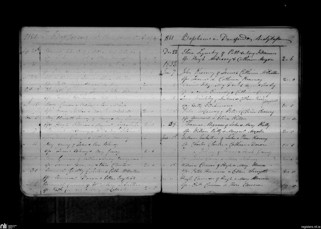 Dunsford; County of Down; Diocese of Down and Connor. Baptisms, Sep. 1851 to Feb. 1852