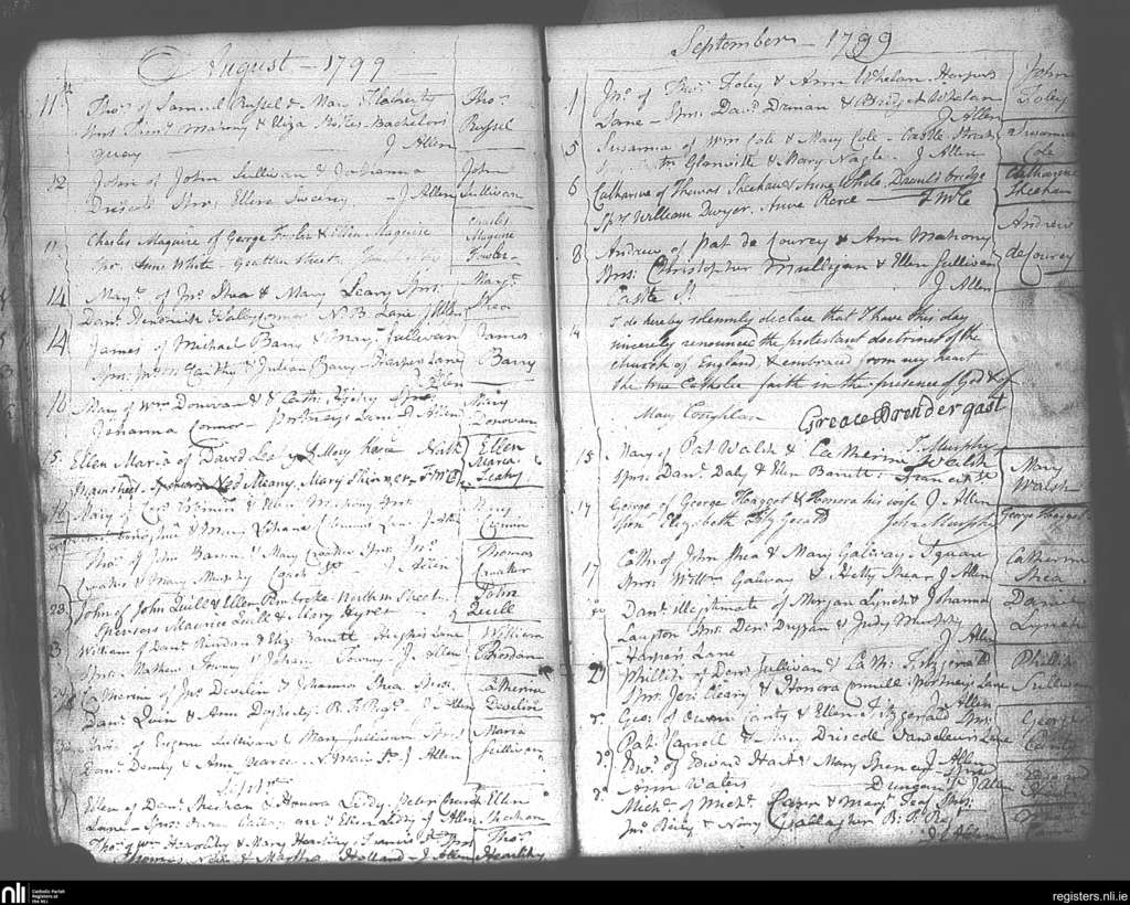 Ss Peter and Paul's, Cork city; County of Cork; Diocese of Cork and Ross. Baptisms, Aug. 1799 to Sep. 1799