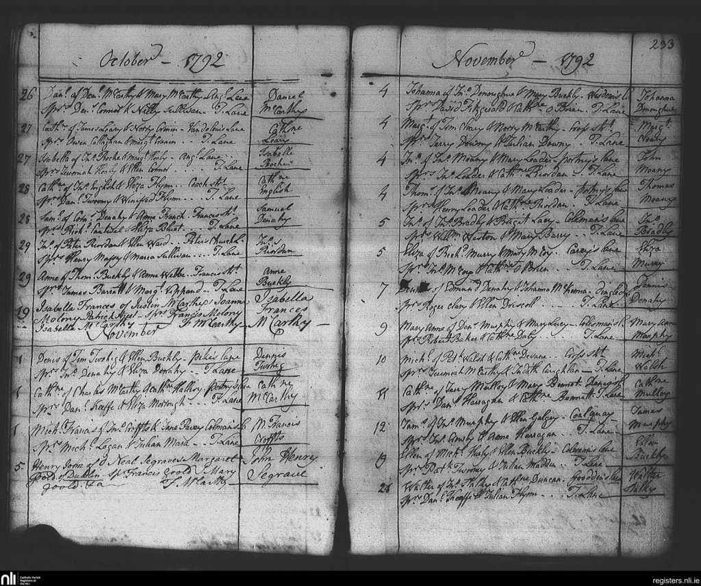 Ss Peter and Paul's, Cork city; County of Cork; Diocese of Cork and Ross. Baptisms, Oct. 1792 to Nov. 1792