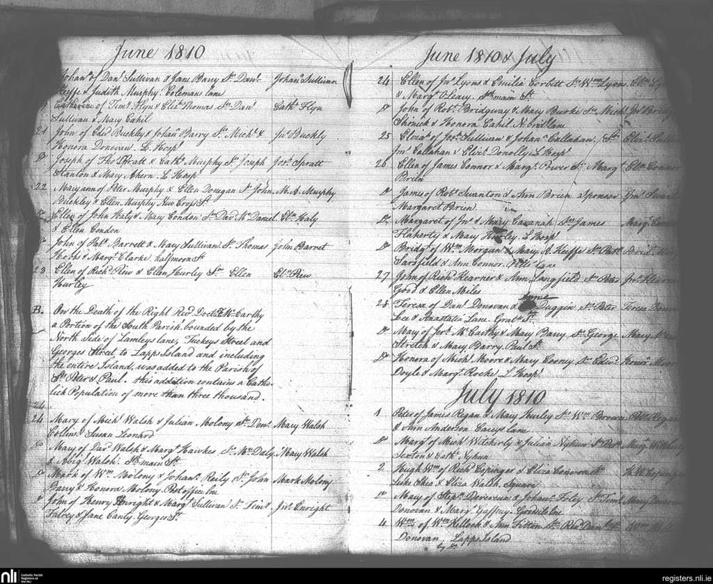 Ss Peter and Paul's, Cork city; County of Cork; Diocese of Cork and Ross. Baptisms, June 1810 to July 1810