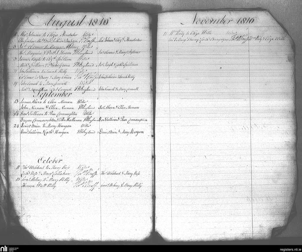 Ss Peter and Paul's, Cork city; County of Cork; Diocese of Cork and Ross. Marriages, Aug. 1816 to Nov. 1816