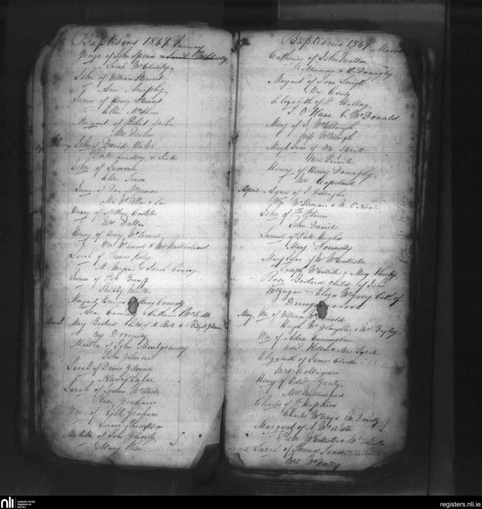St. Mathew's, Ballymacarrett, Belfast city; Contae Antrim; Deoise Down and Connor. Baptisms, Ean. 1847 go dtí an Bealt. 1847
