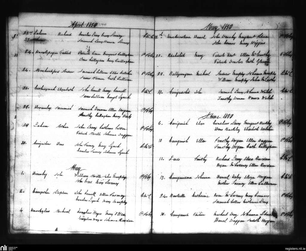 Aghinagh; County of Cork; Diocese of Cloyne. Baptisms, Apr. 1850 to June 1850