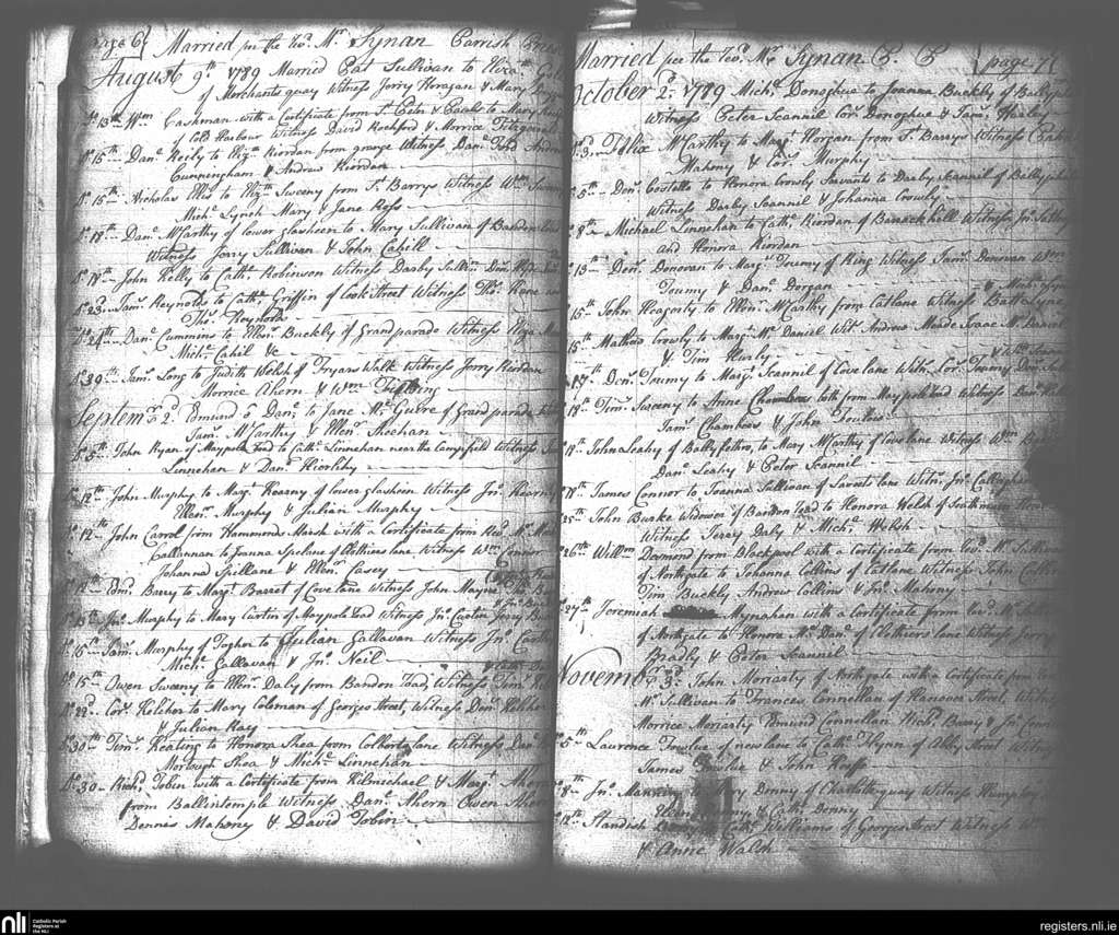 St. Finbarr's, Cork city; County of Cork; Diocese of Cork and Ross. Marriages, Aug. 1789 to Nov. 1789