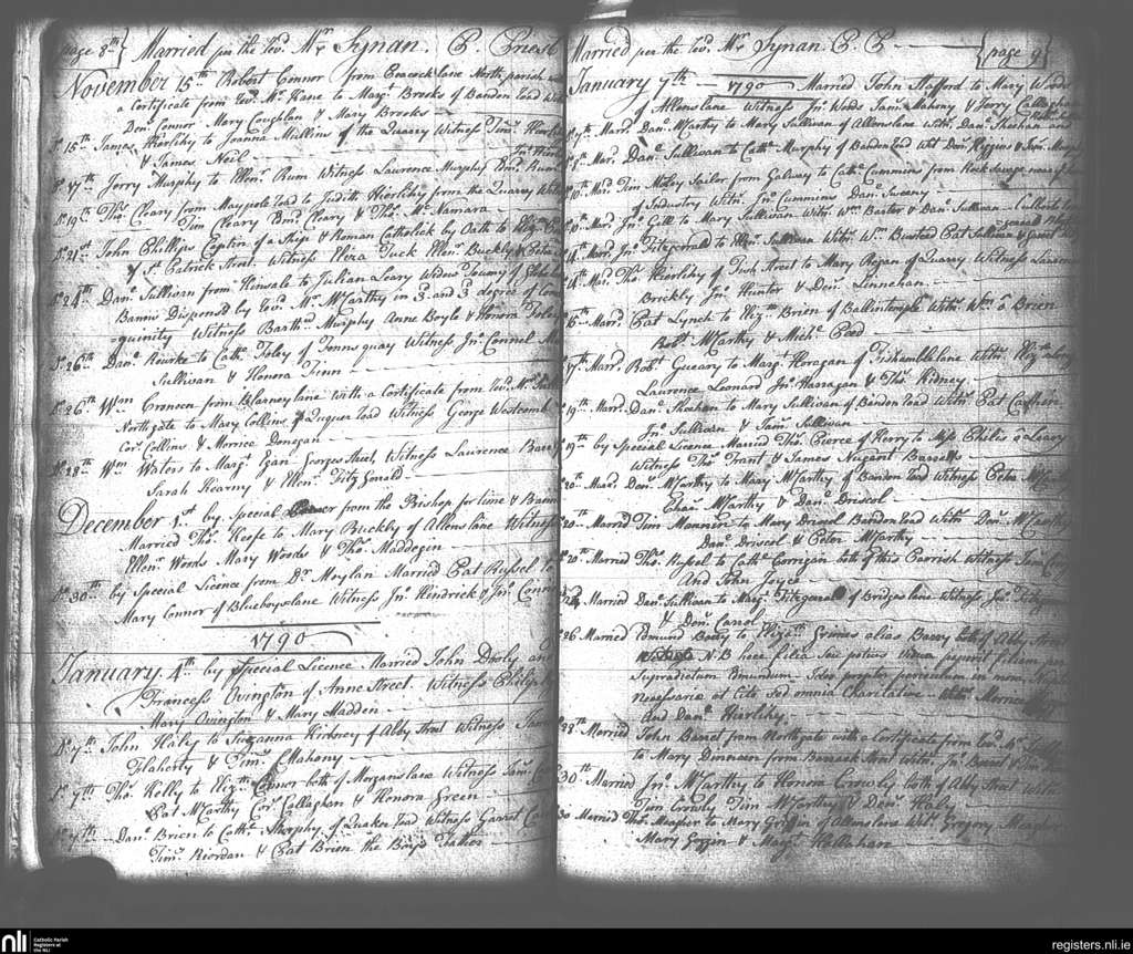 St. Finbarr's, Cork city; County of Cork; Diocese of Cork and Ross. Marriages, Nov. 1789 to Jan. 1790