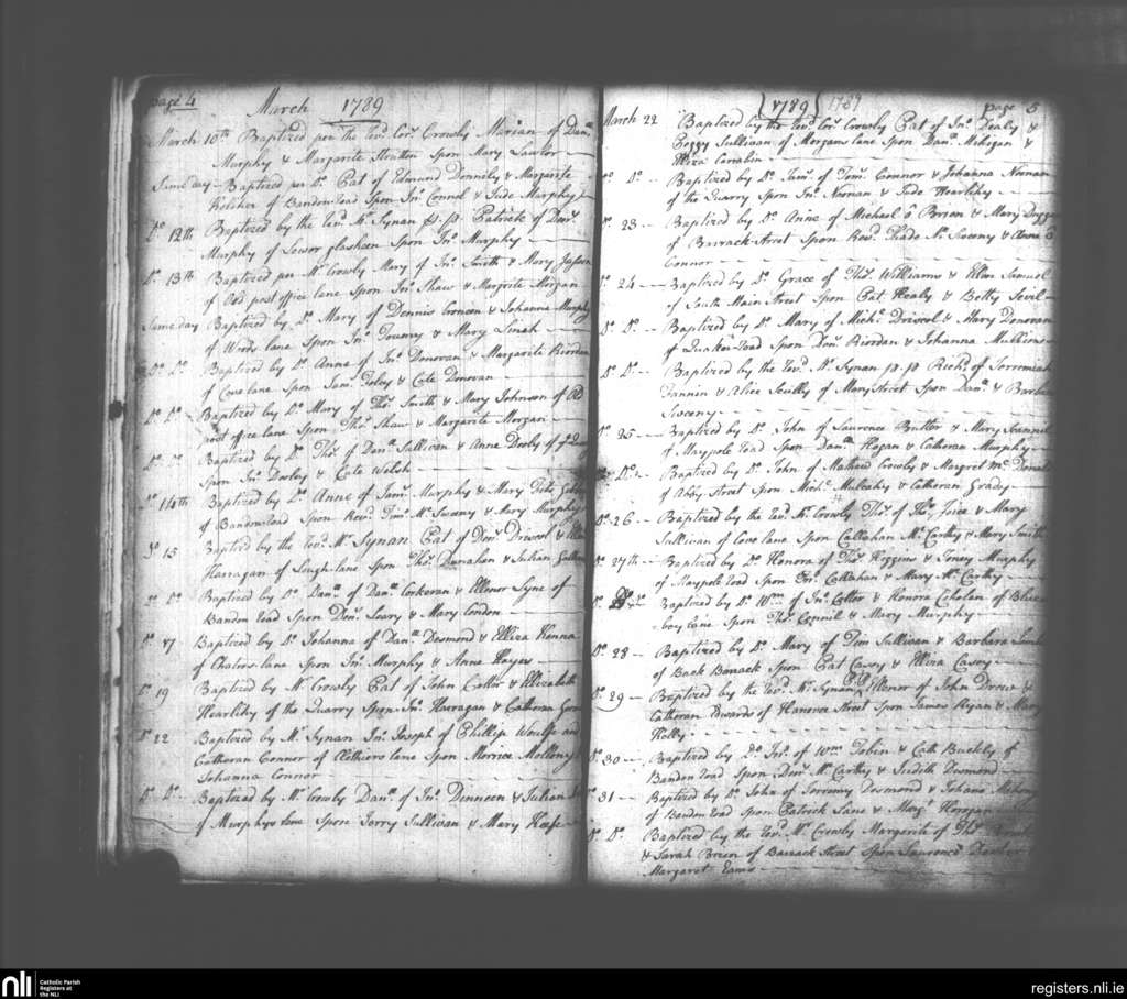 St. Finbarr's, Cork city; County of Cork; Diocese of Cork and Ross. Baptisms, Mar. 1789