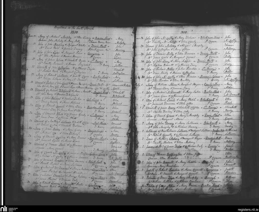 St. Finbarr's, Cork city; County of Cork; Diocese of Cork and Ross. Baptisms, June 1810 to July 1810