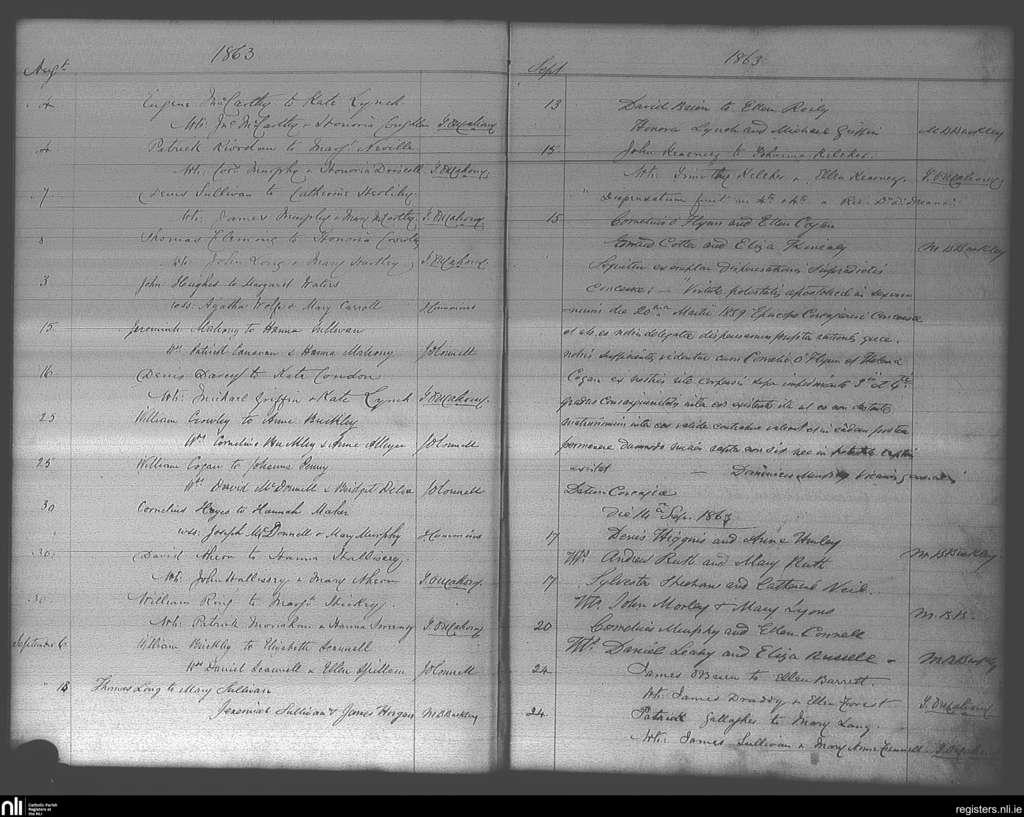St. Finbarr's, Cork city; County of Cork; Diocese of Cork and Ross. Marriages, Aug. 1863 to Sep. 1863