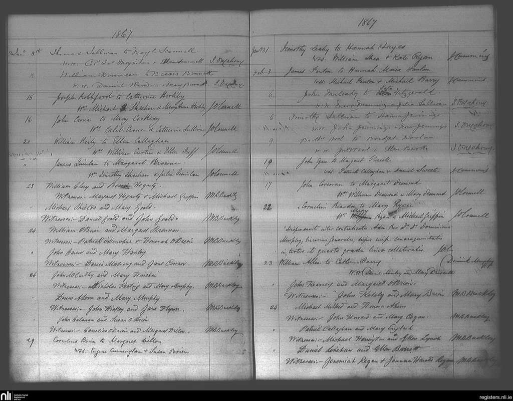 St. Finbarr's, Cork city; County of Cork; Diocese of Cork and Ross. Marriages, Jan. 1867 to Feb. 1867