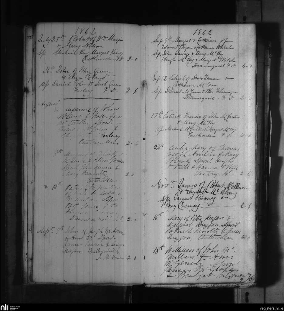 Castlewellan; County of Down; Diocese of Down and Connor. Baptisms, July 1862 to Nov. 1862