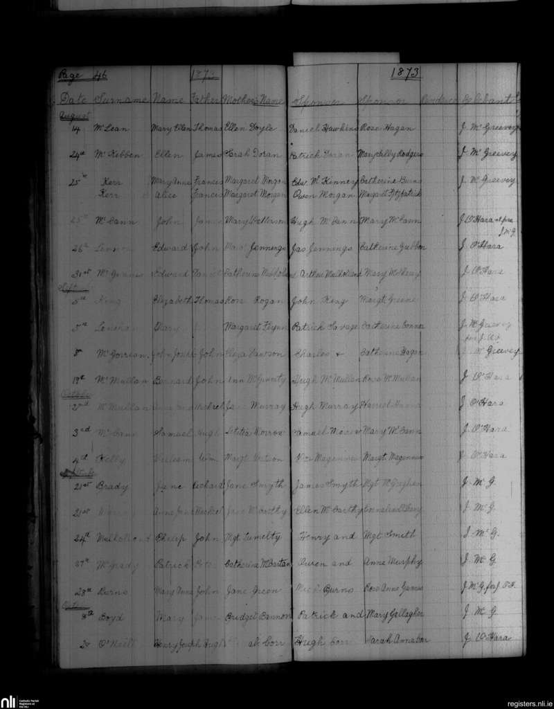 Castlewellan; County of Down; Diocese of Down and Connor. Baptisms, Aug. 1873 to Oct. 1873