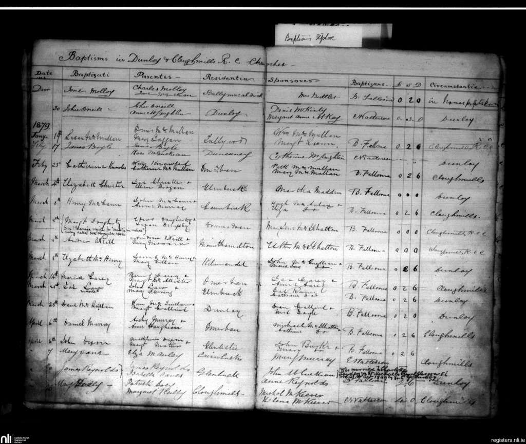 Dunloy; County of Antrim; Diocese of Down and Connor. Baptisms, Dec. 1878 to Apr. 1879