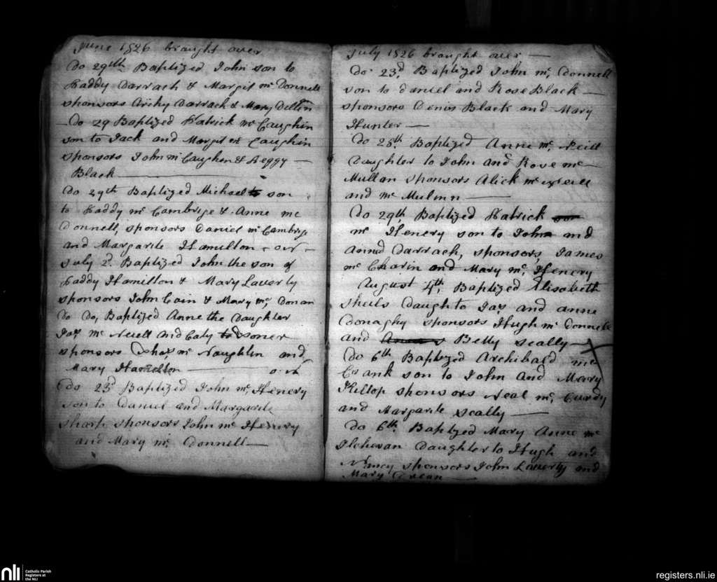 Culfeightrin; County of Antrim; Diocese of Down and Connor. Baptisms, June 1826 to Aug. 1826