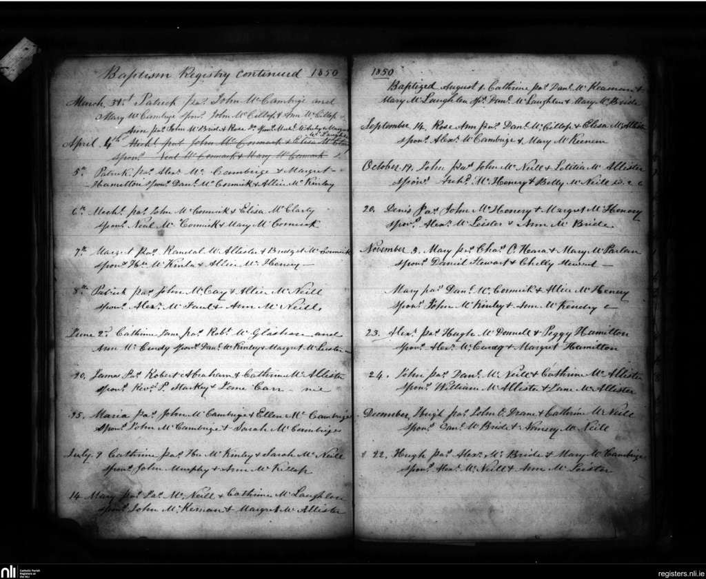 Culfeightrin; County of Antrim; Diocese of Down and Connor. Baptisms, Mar. 1850 to Dec. 1850