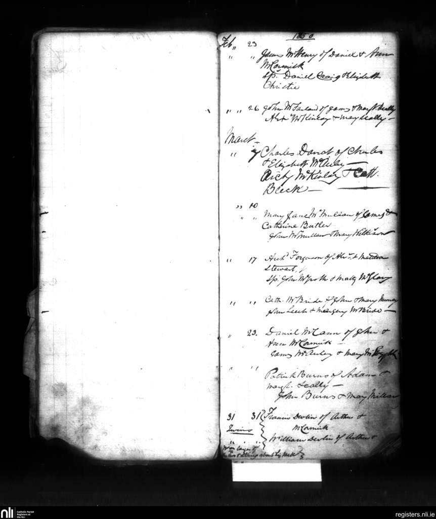 Culfeightrin; County of Antrim; Diocese of Down and Connor. Baptisms, Feb. 1850 to Mar. 1850