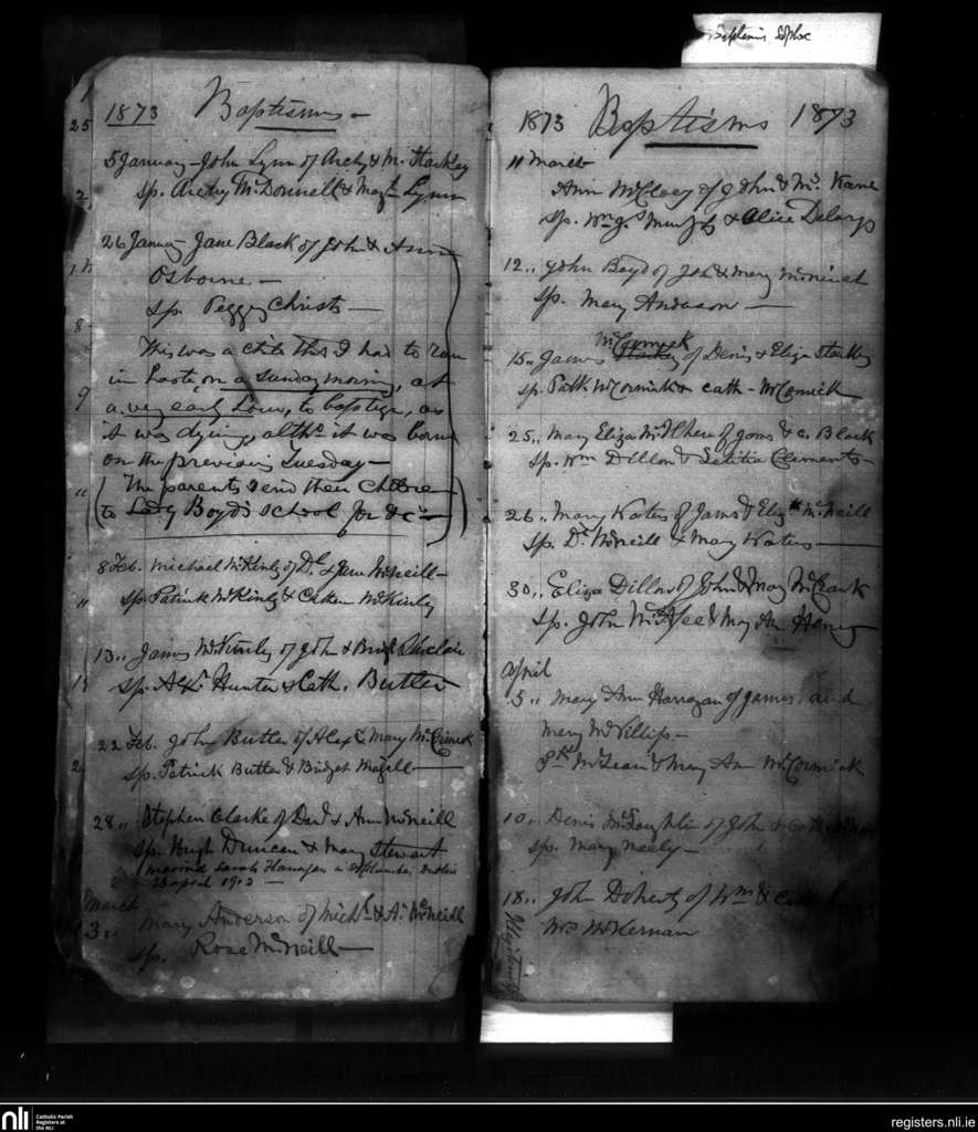 Culfeightrin; County of Antrim; Diocese of Down and Connor. Baptisms, Jan. 1873 to Apr. 1873