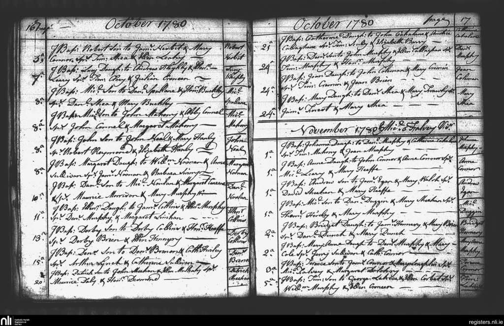 St. Mary's, Cork city; County of Cork; Diocese of Cork and Ross. Baptisms, Oct. 1780 to Nov. 1780