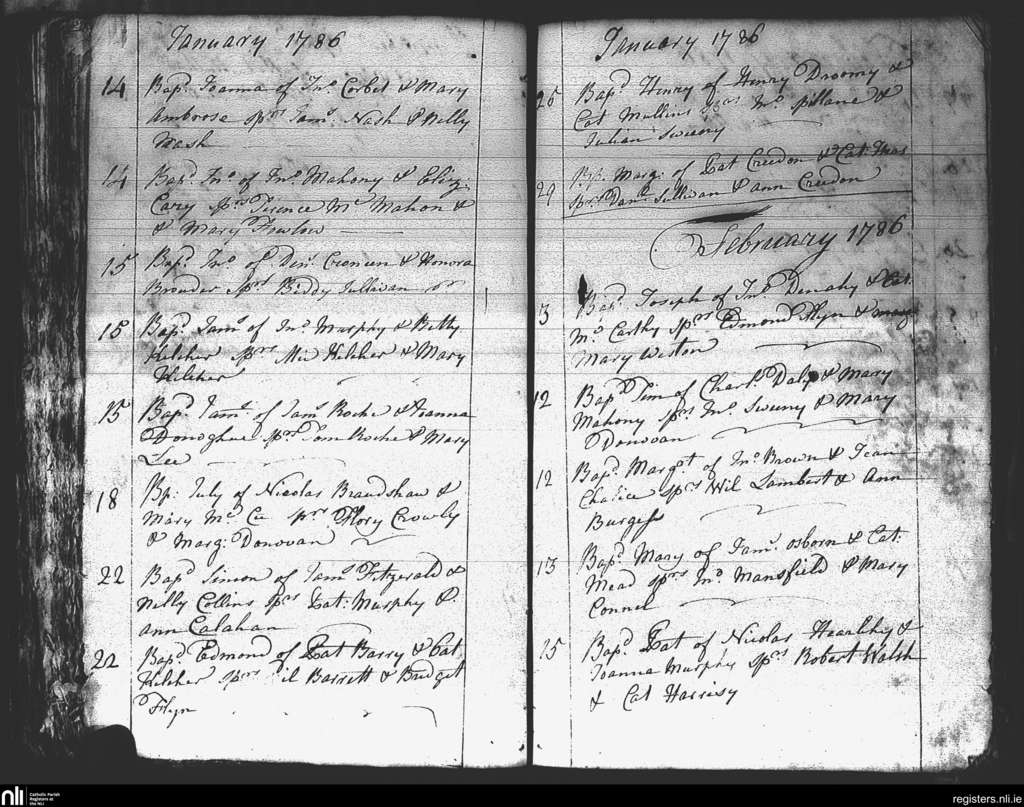 St. Mary's, Cork city; County of Cork; Diocese of Cork and Ross. Baptisms, Jan. 1786 to Feb. 1786