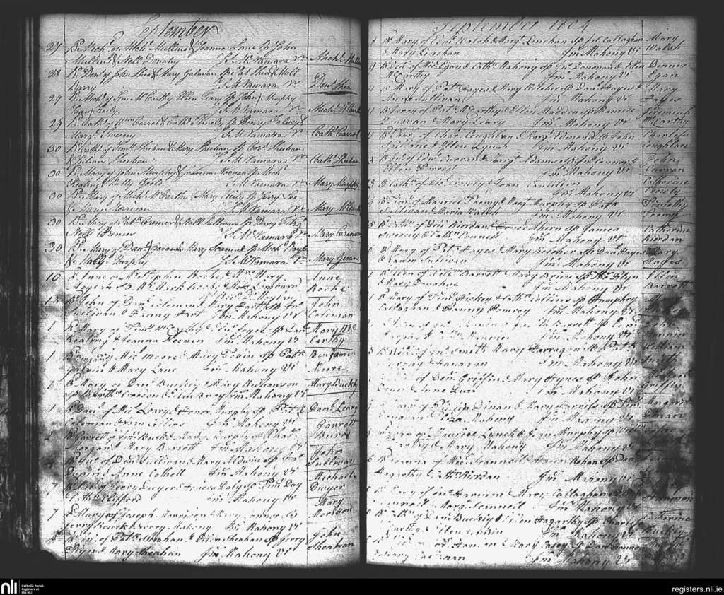 St. Mary's, Cork city; County of Cork; Diocese of Cork and Ross. Baptisms, Sep. 1804