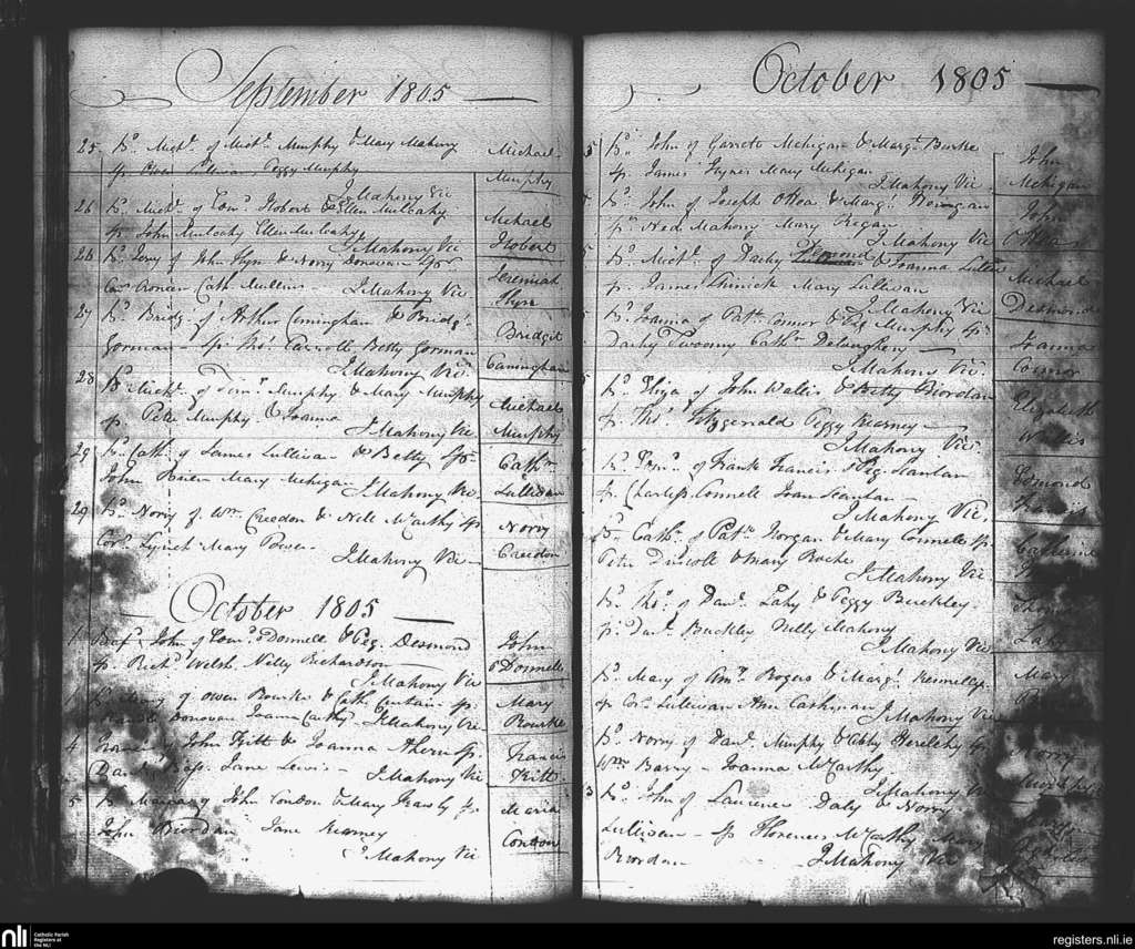St. Mary's, Cork city; County of Cork; Diocese of Cork and Ross. Baptisms, Sep. 1805 to Oct. 1805